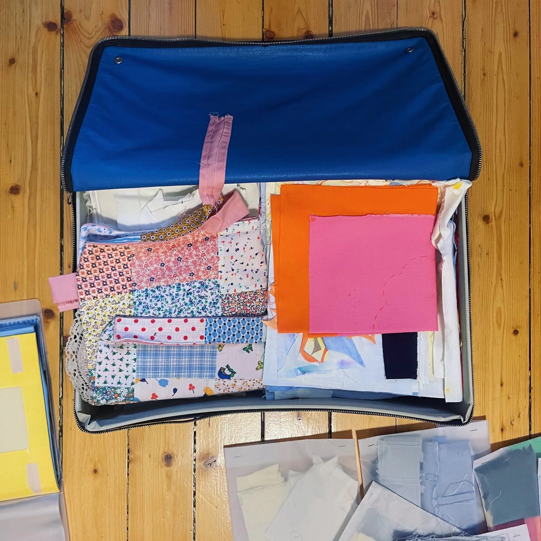 Just like a store front that’s still closed, but moving inside: there are a few boxes where I’ve been organising some of my favourite tools: pens, pencils, craft supplies, bundles of coloured paper and vintage fabrics. I’ll organise it better and add more “shelves” over time as I continue the ongoing (never-finished) process of building a website.